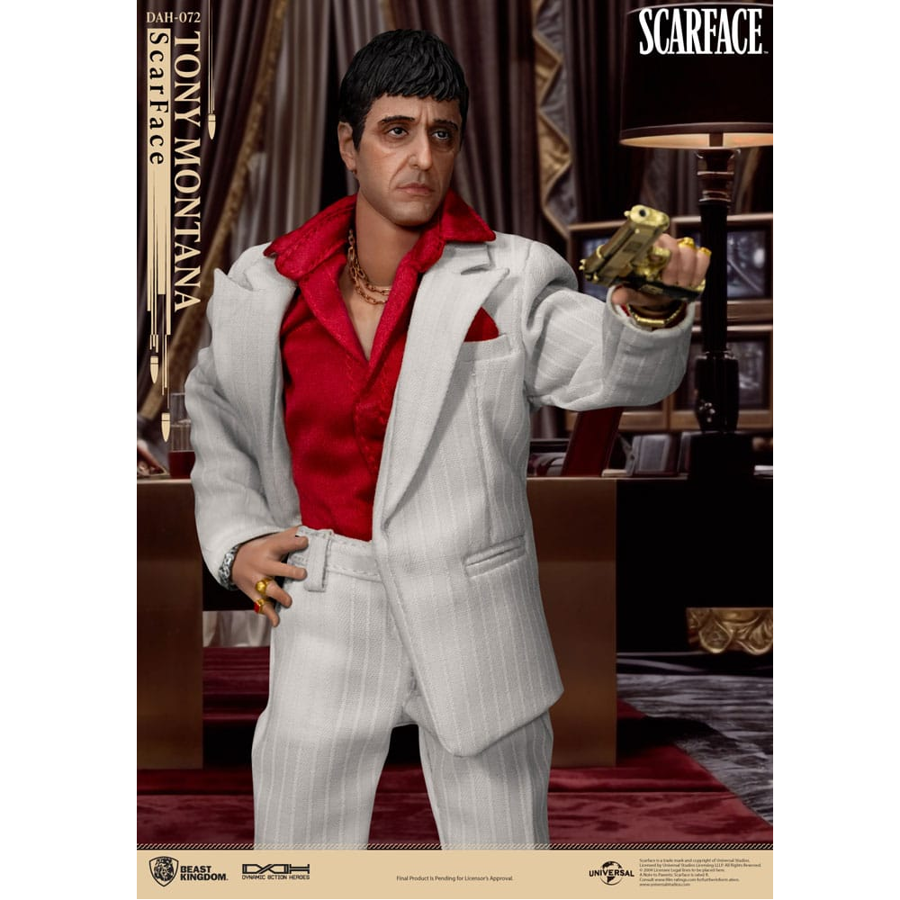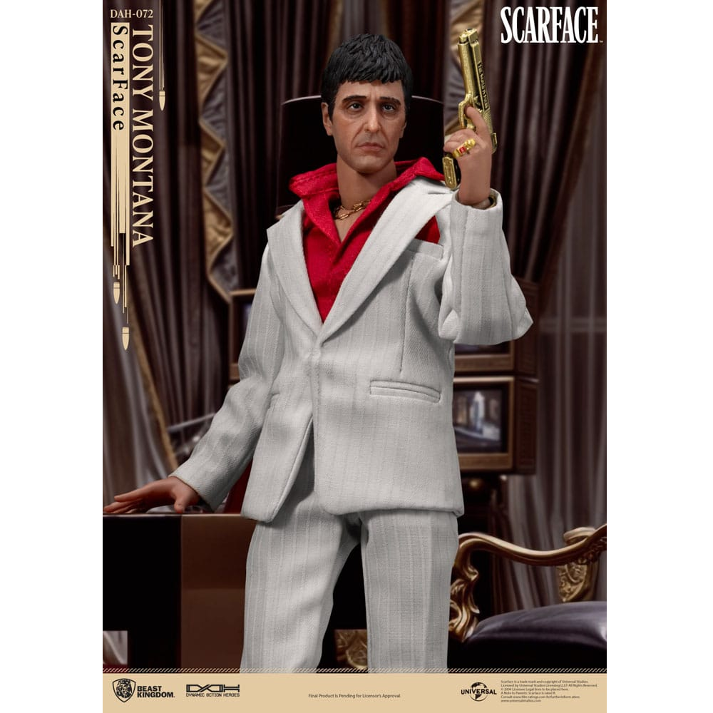Deze Tony Montana action figure van Beast Kingdom lijkt sprekend op Al Pacino die Tony Montana in de film Scareface speelde. Inclusief wit kostuum met rood overhemd. Tony Montana komt met zijn gouden pistool en zijn machine geweer. Daarnaast wordt er een goud gekleurde ketting meegeleverd en een horloge. Hij kan op 22 punten bewegen en komt tevens met een hoop extra handen.