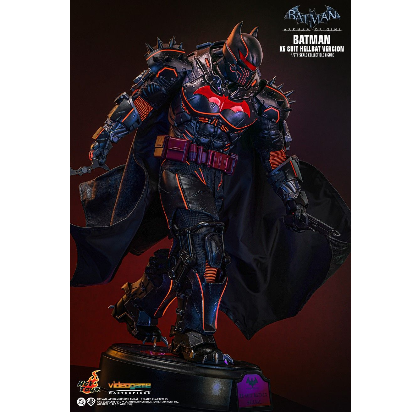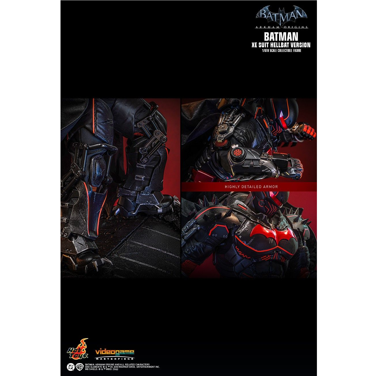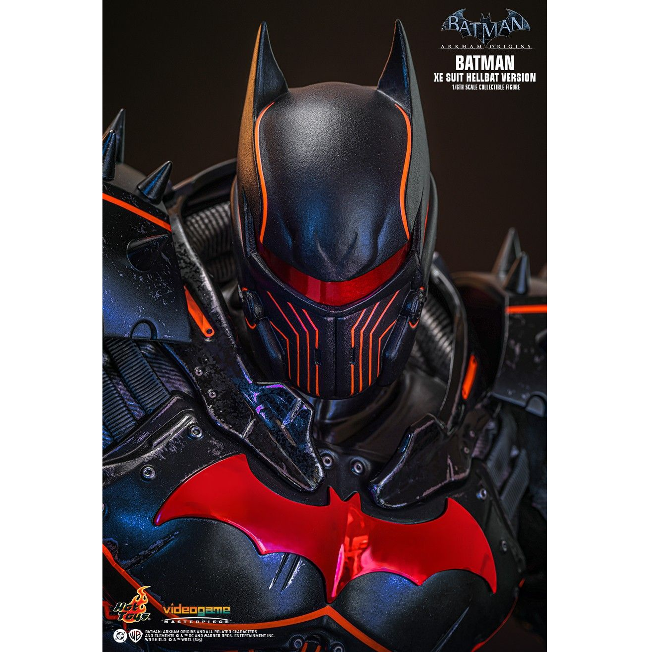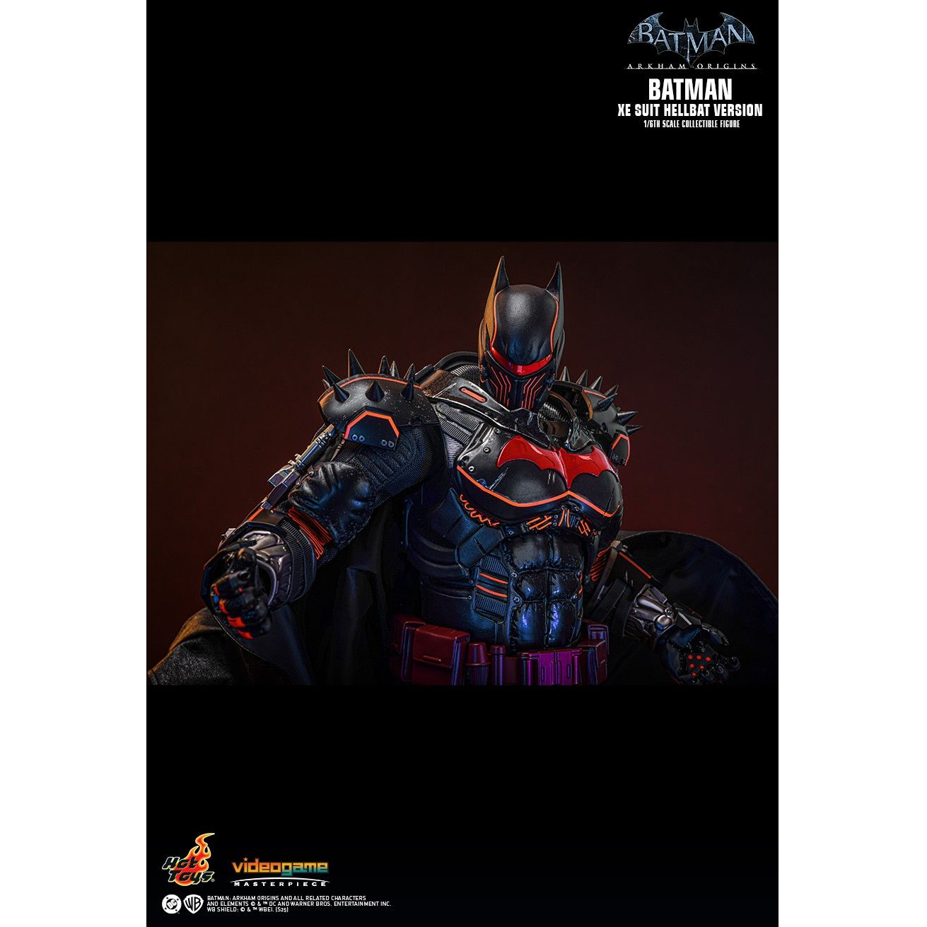 - Authentic and detailed likeness of Batman wearing XE Suit Hellbat Version inspired by Batman: Arkham Origins story DLC “Cold, Cold Heart” and DC Comics