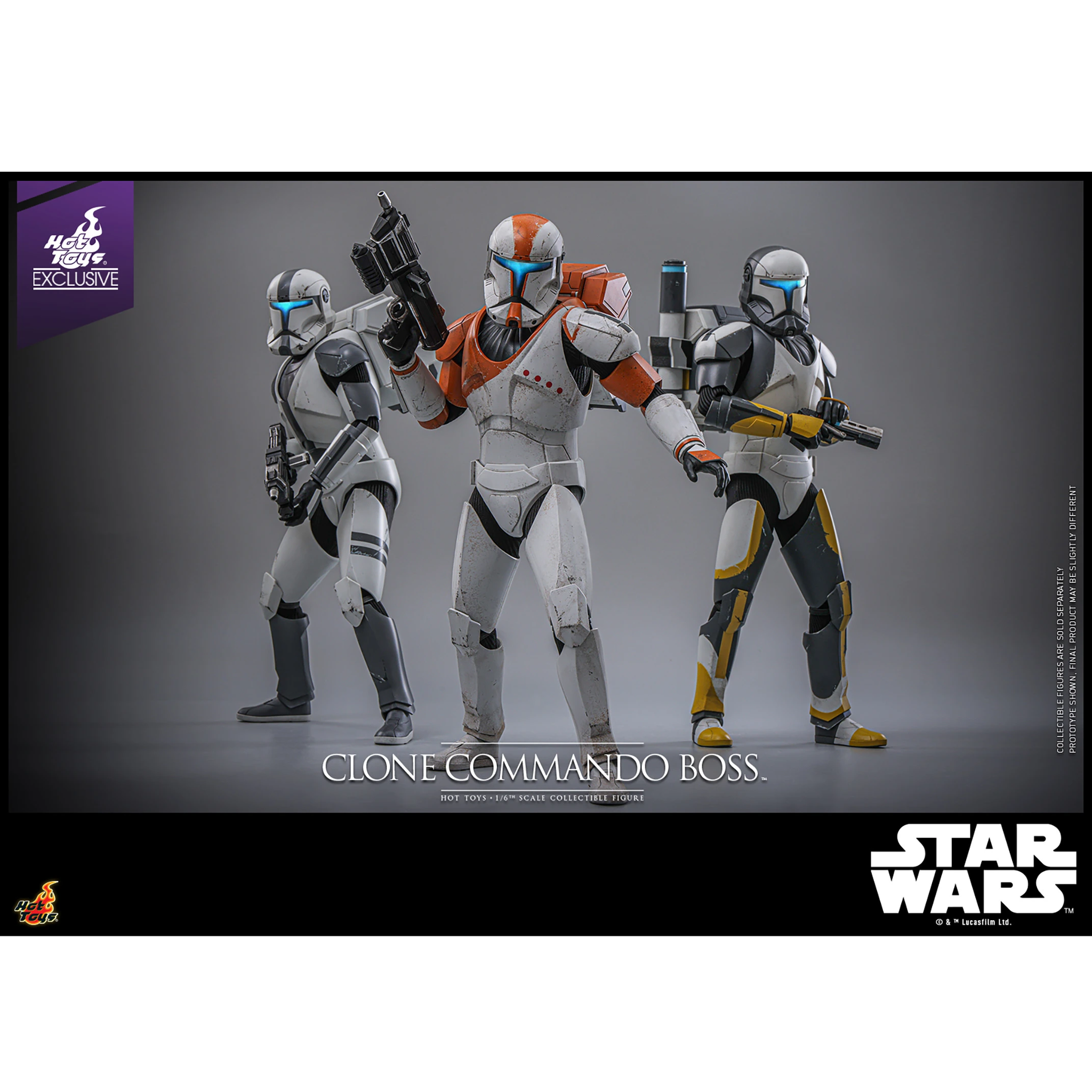 Deze Clone Commando Boss action figure van Hot Toys is een gelimiteerde Hot Toys exclusive en komt met veel extra handen, 2 pistolen, blaster rifle, datapad en standaard. Daarnaast wordt er een rugtas meegeleverd die open kan en is zijn helm voorzien van LED verlichting. De Clone Commando Boss kan op 30 punten bewegen en is voorzien van extreem veel details. Gelimiteerde oplage van 2500 stuks wereldwijd.