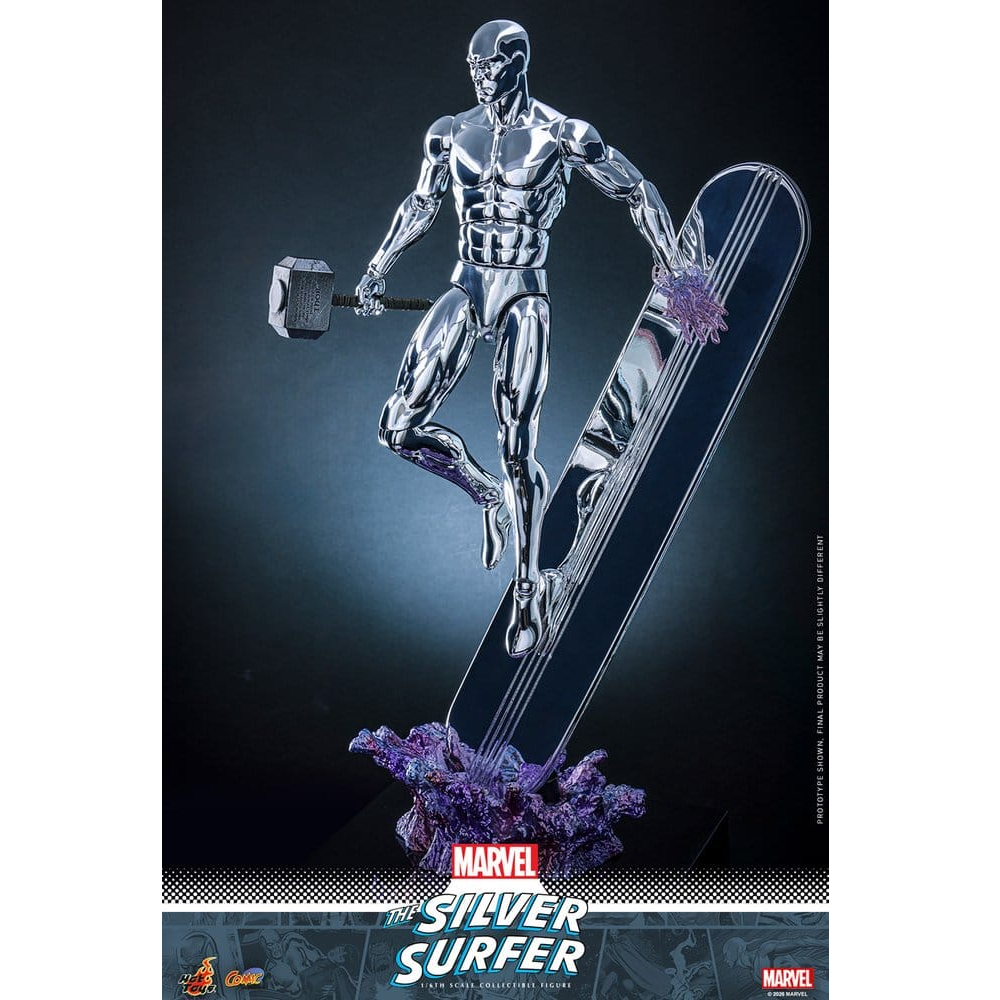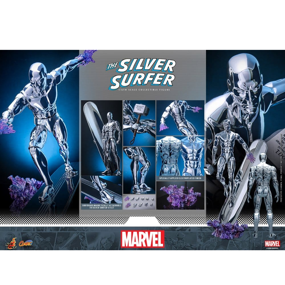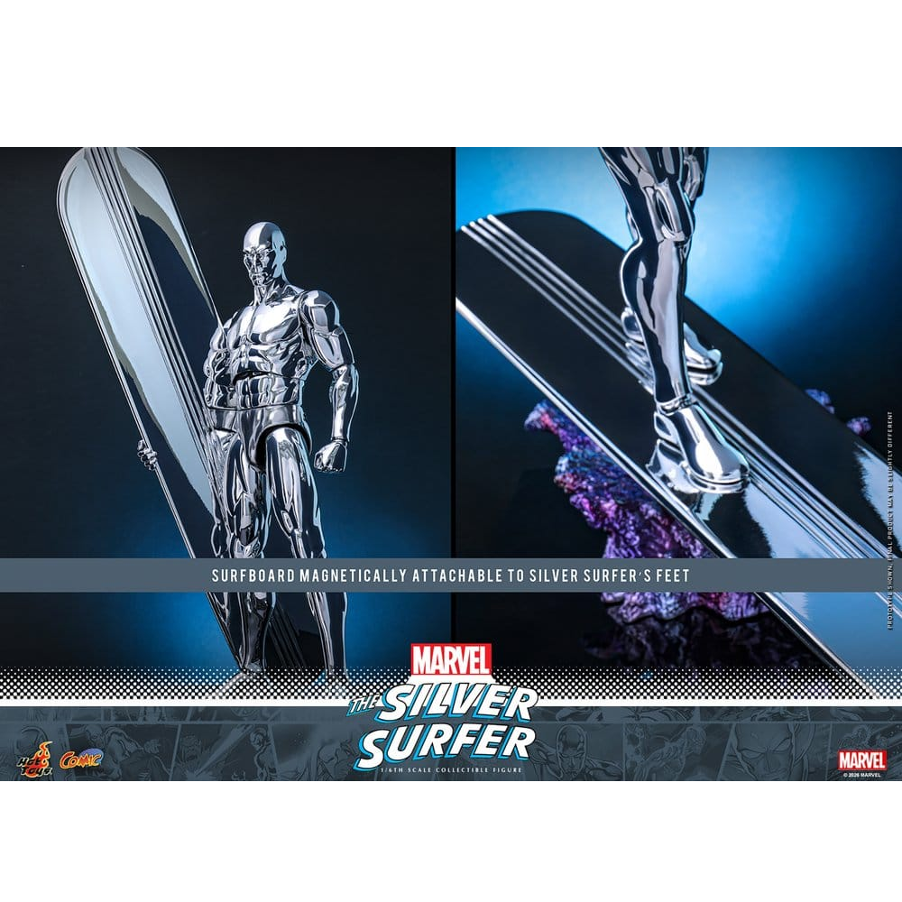 Hot Toys komt met de ultieme Silver Surfer action figure. Deze 32cm hoge Silver Surfer kan via magneten aan zijn surfboard worden bevestigd. Zo kun je veel hem op veel manier poseren. Hij wordt geleverd met Thor's hamer Mjölnir en veel extra handen waaronder enkele handen met effecten. Ook wordt er een luxe standaard meegeleverd. Uiteraard is er veel aandacht besteed aan zijn silveren look met speciale verf die Hot Toys heeft gebruikt.