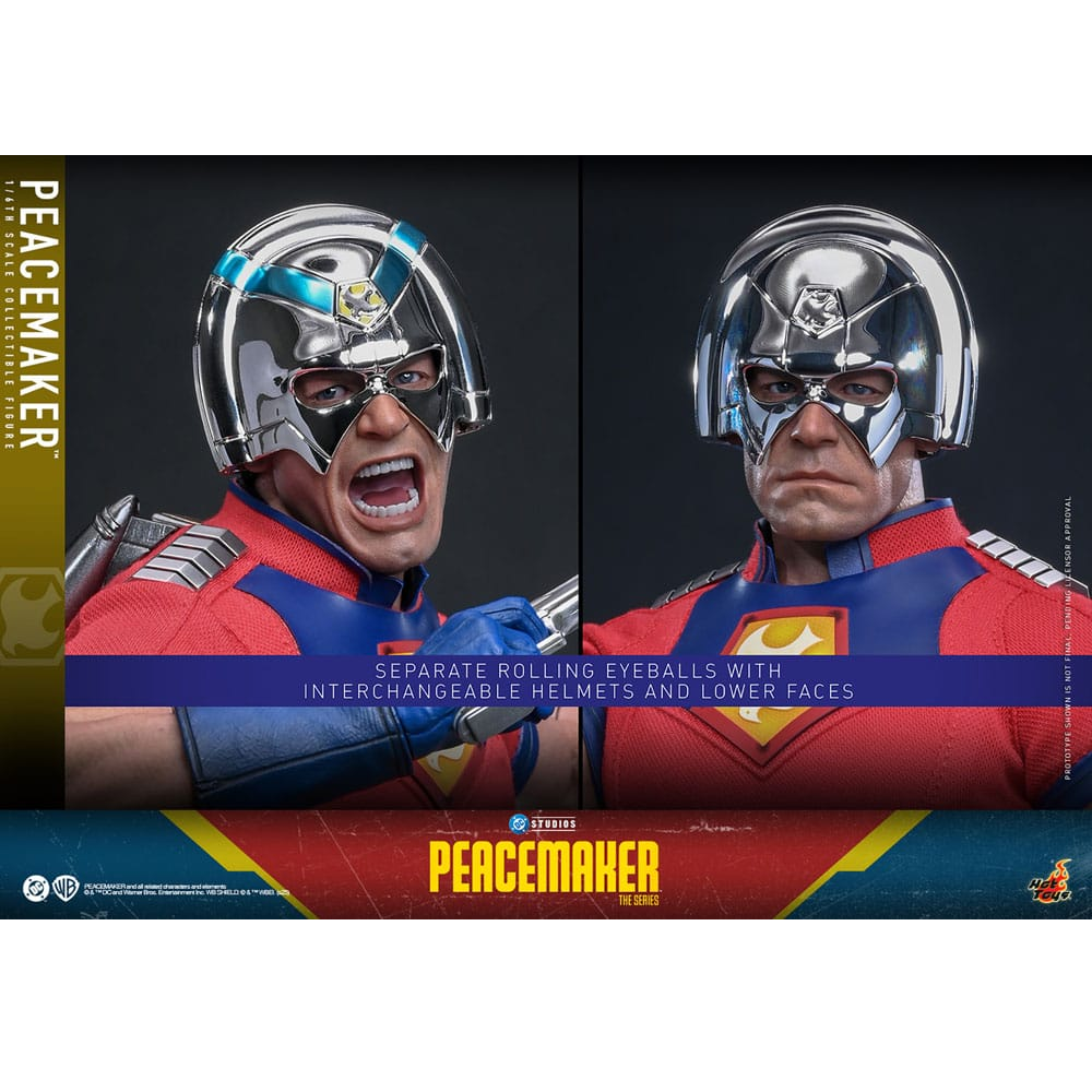 Deze Peacemaker action figure van Hot Toys is voorzien van extreem veel details en is 31cm hoog. Peacemaker is voorzien van zijn outfit uit Peacemaker the series en komt met veel accessoires. Er worden veel evrschillende handen meegeleverd, een pistool, geluidsdemper, zwaard, tomahawk bijl, jetpack en zijn Eagly sidekick. Er worden twee verschillende helmen en monden meegeleverd met een magnetische tong. Uiteraard wordt er ook een luxe standaard meegeleverd.