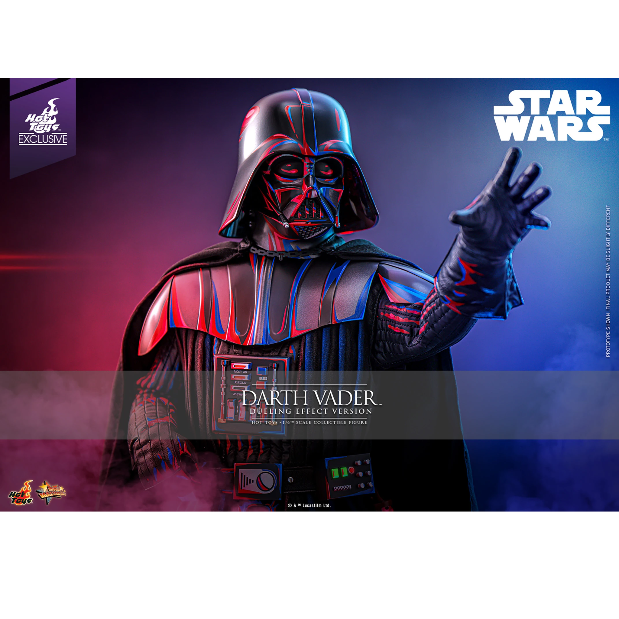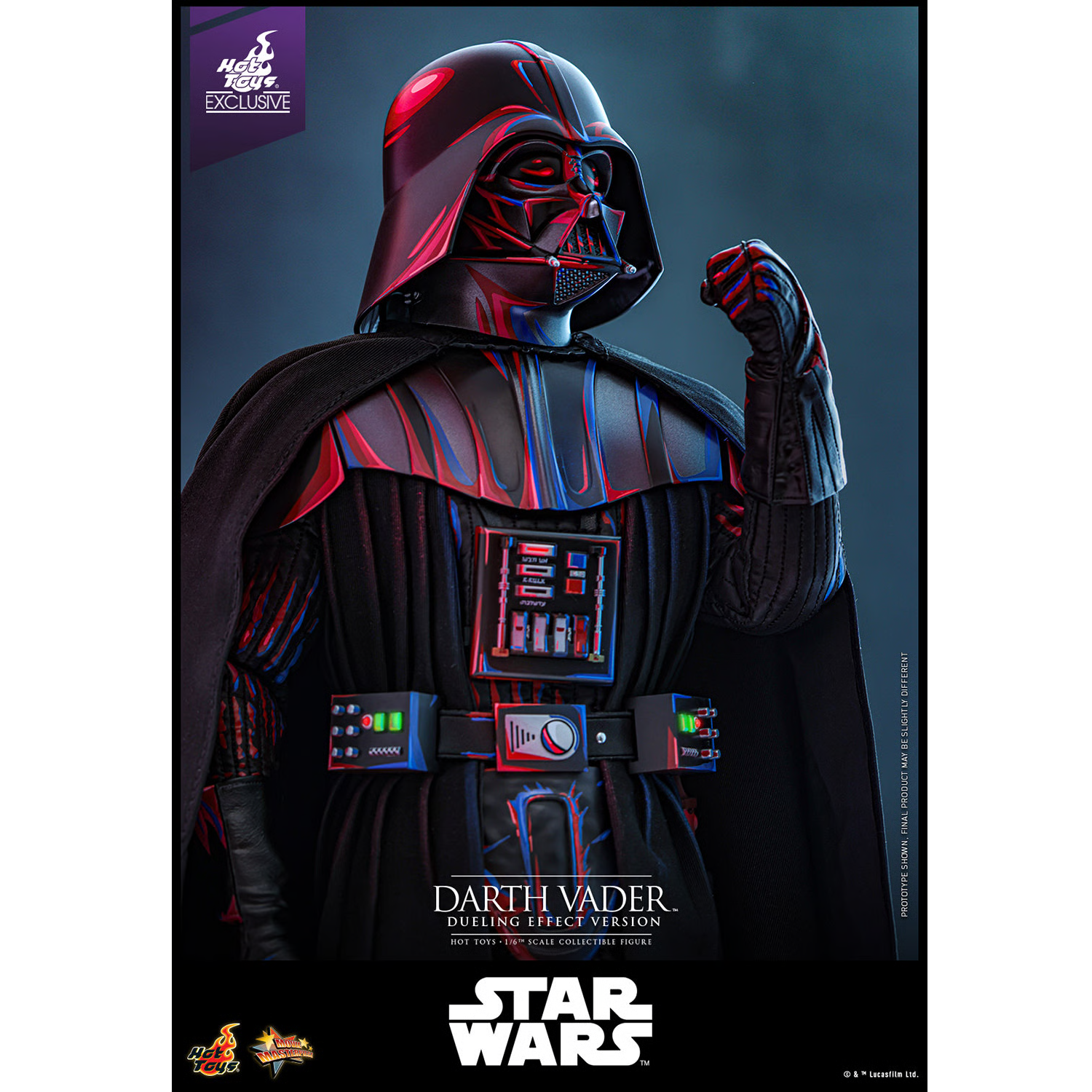 Deze Darth Vader (Dueling Effect Version) action figure van Hot Toys is een gelimiteerde Hot Toys exclusive waarvan er slechts 2000 van zijn gemaakt. Deze Darth Vader is voorzien van een speciaal Dueling Effect design met rode en blauwe accenten. Darth Vader is voorzien van LED verlichte riem en instrumentenpaneel op zijn borst. Zijn lightsaber is ook voorzien van LED en komt met extra opzetstuk voor bewegingseffecten. Er worden veel extra handen meegeleverd en een luxe standaard.