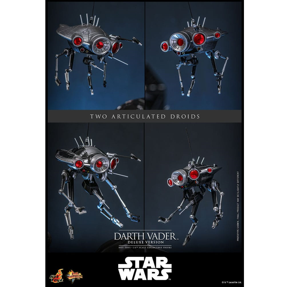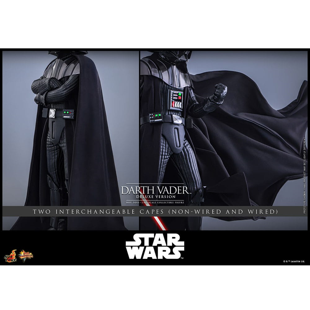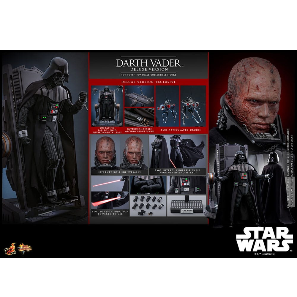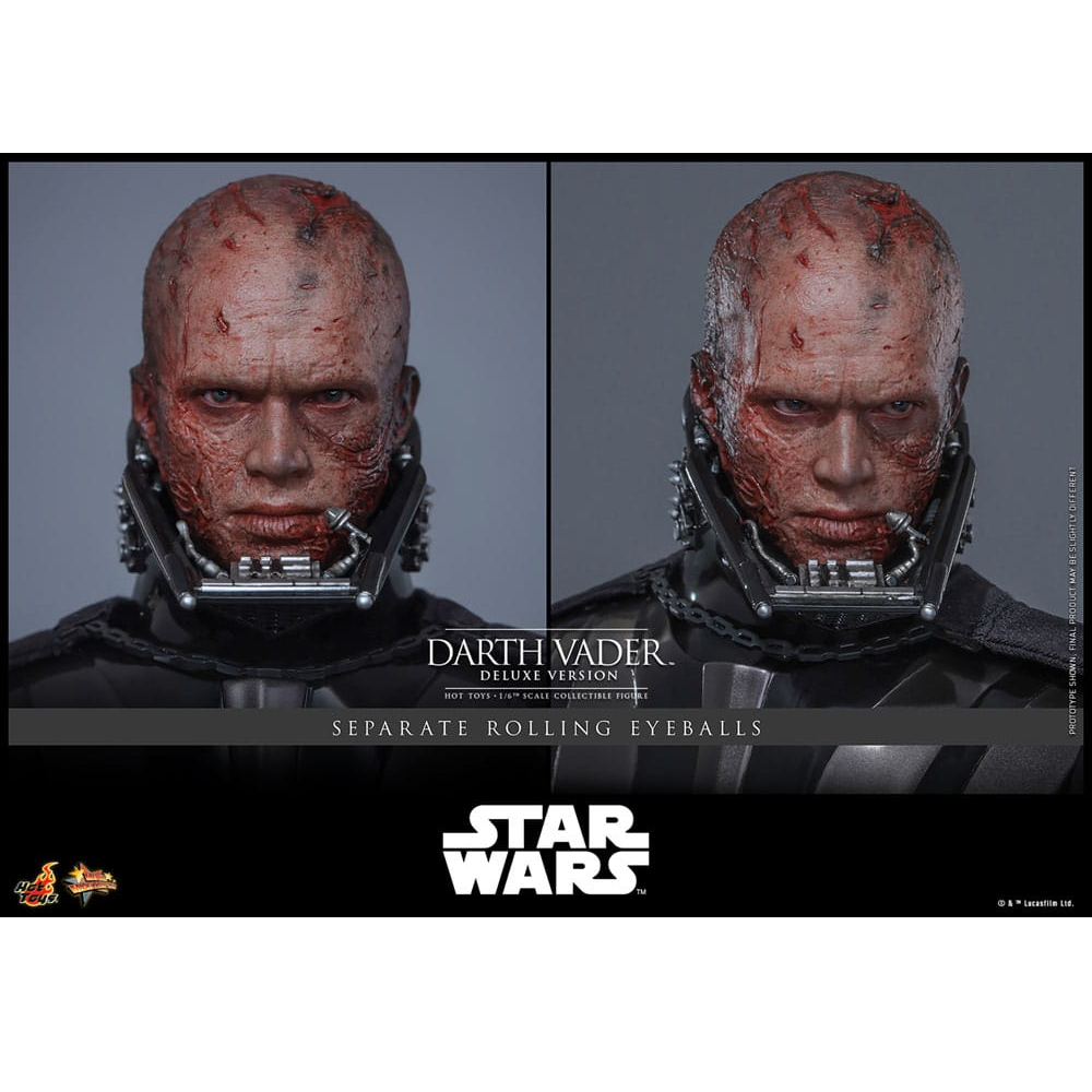 Het hoofd van Darth Vader beschikt over het Hot Toys rolling eyeball systeem waarmee elk oog individueel van elkaar is te bewegen. Dit in combinatie met de extreme details van het hoofd geeft je nog meer poseer mogelijkheden. Daarnaast wordt er natuurlijk een helm meegeleverd, veel extra handen, en twee capes waarvan 1 wired is. Zijn lightsaber en bortskast paneel zijn voorzien van LED verlichting.