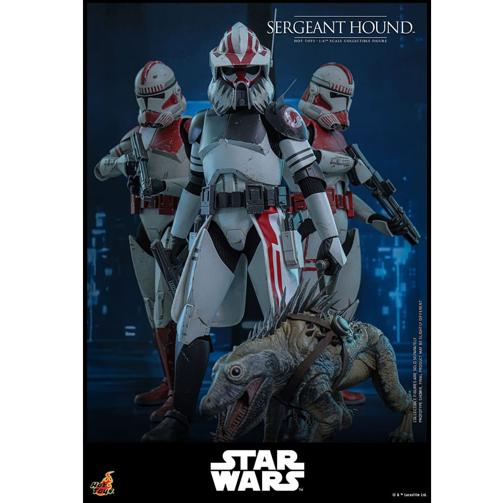 Deze Sergeant Hound action figure van Hot Toys is voorzien van extreem veel details. Zijn outfit is voorzien van gevechtschade en slijtage plekken voor een zo authentiek mogelijke look. Sergeant Hound komt met 7 handen, standaard, blaster rifle en 2 blaster pistols.