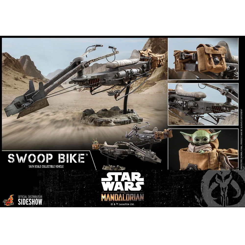 Deze Swoop Bike uit Star Wars: the Mandalorian is gemaakt door Hot Toys en komt met een kleine Grogu die plaats kan nemen in één van de tassen achterop de Swoop Bike. Hot Toys heeft deze Swoop Bike tot in detail nagemaakt en de bekleding en tassen gemaakt van hoogwaardige stoffen materialen. De Swoop Bike is 59cm lang, 25cm hoog en 13cm breed. Hij biedt ruimte aan Hot Toys figuren uit de the Mandalorian serie en komt met een luxe standaard. Bepaalde onderdelen van de Swoop Bike kunnen bewegen om zo de juiste pasvorm te bieden voor figuren die kunnen plaatsnemen.