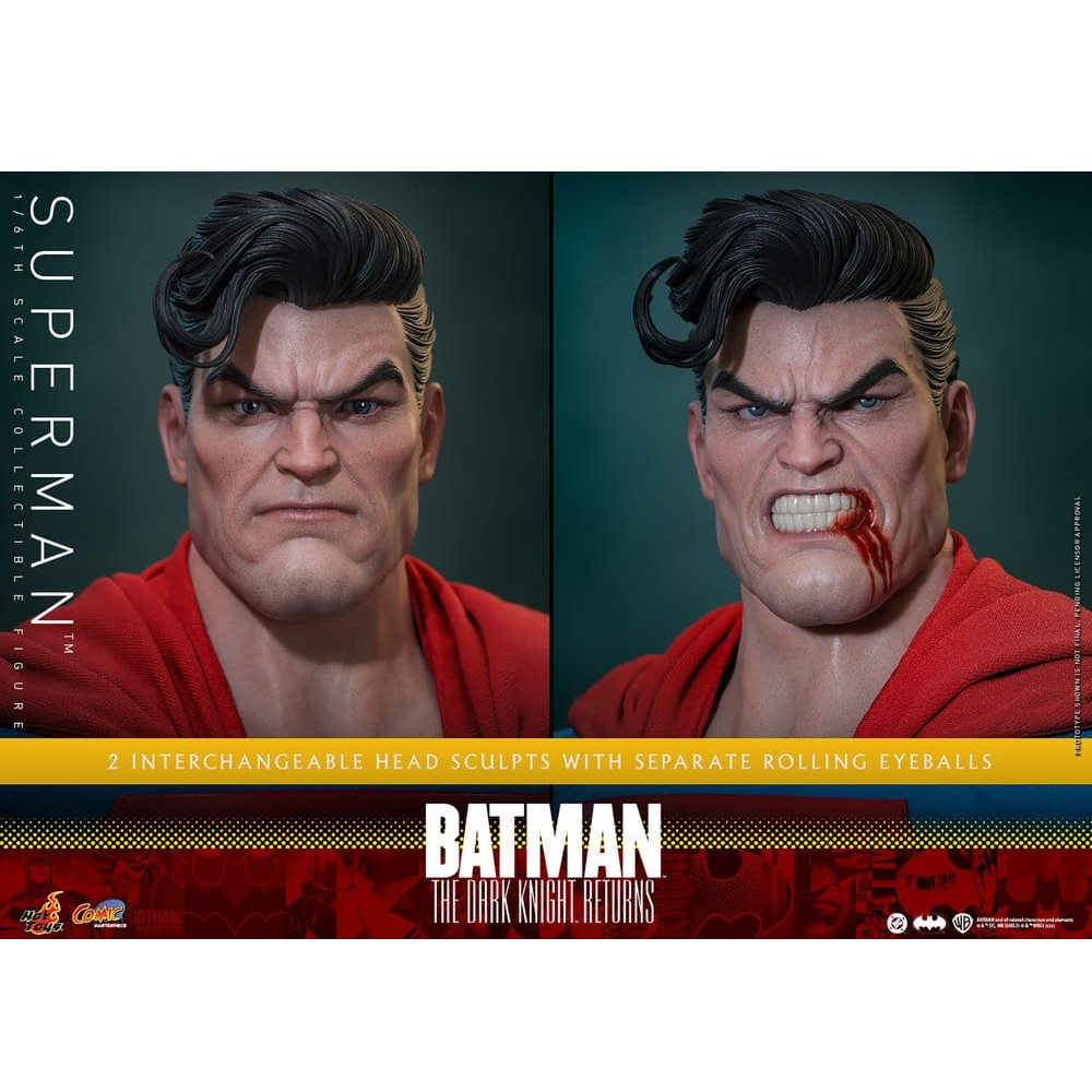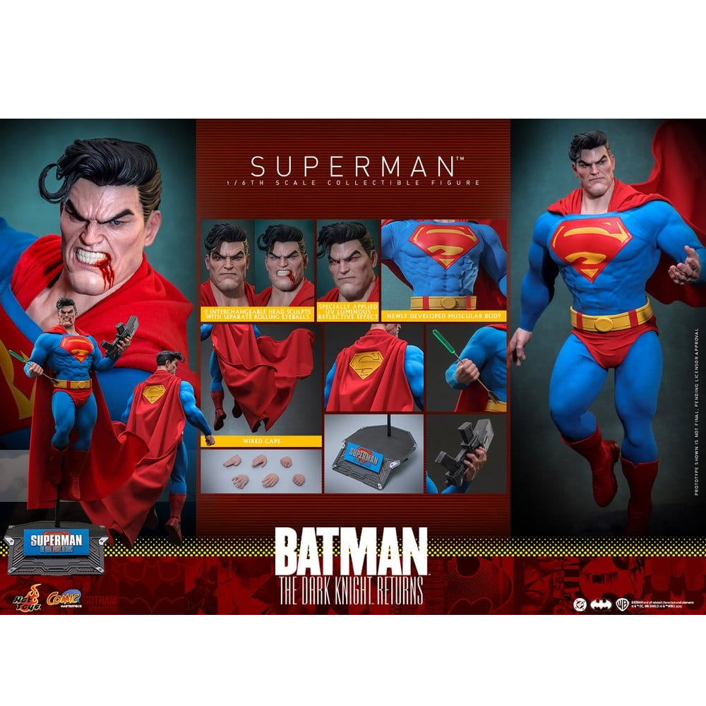 Deze Superman action figure is gebaseerd op The Dark Knight Returns Comic en is 34cm hoog. Superman wordt geleverd met veel accessoires. Zijn pak is gemaakt van rekbaar stof met een wired cape zodat je nog meer poseer mogelijkheden hebt. Er worden twee hoofden meegeleverd die beide voorzien zijn van het Hot Toys rolling eyeball systeem zodat je elk oog individueel van elkaar kunt bewegen. Beide hoofden hebben speciale verf in de ogen die oplichten wanneer je er met een UV lamp op schijnt. Superman komt met pijl, gebogen sonic gun, veel extra handen en een luxe standaard.
