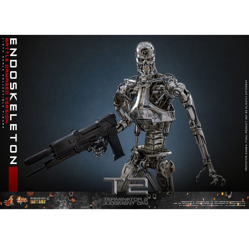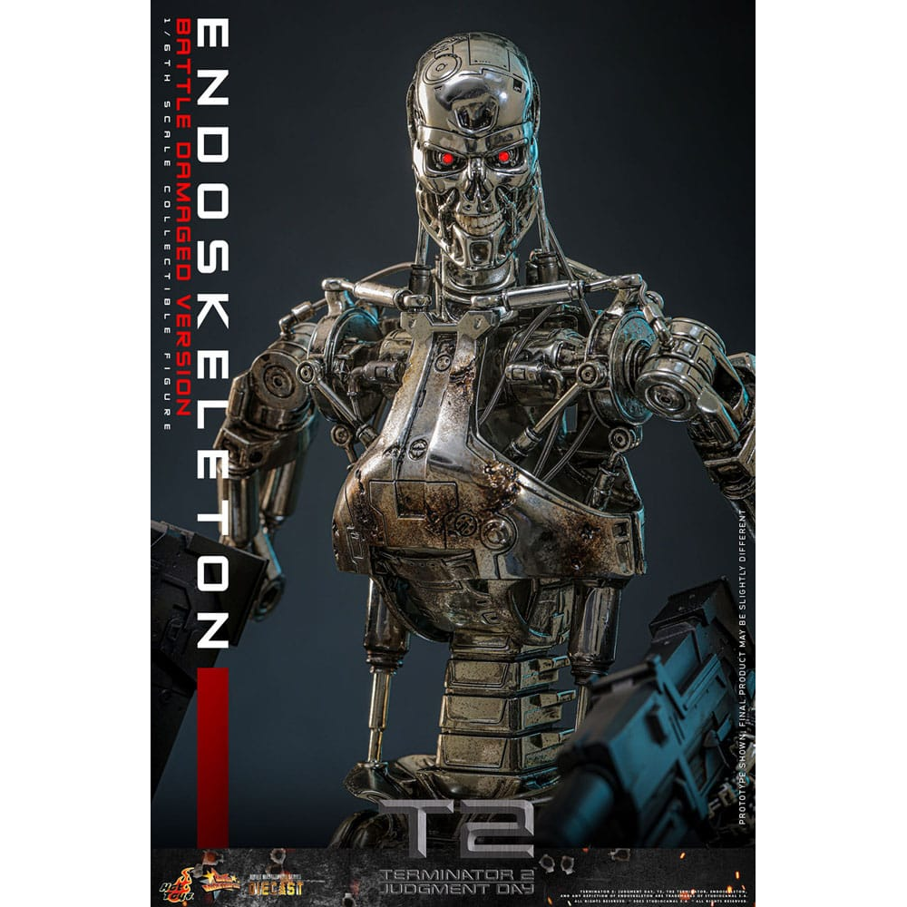 Deze Battle Damaged Endoskeleton uit Terminator 2: Judgment Day is tot in extreem detail nagemaakt door Hot Toys en is voorzien van LED verlichte ogen. Deze Endoskeleton kan op veel punten bewegen en komt met verschillende onderdelen zodat je hem in allerlei poses kunt poseren. Er wordt een luxe standaard meegeleverd en twee wapen accessoires.