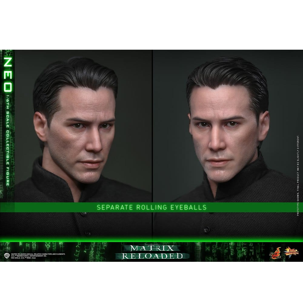 Deze action figure van Neo uit the Matrix Reloaded is tot in extreem detail nagemaakt door Hot Toys. Neo is voorzien van individueel beweegbare ogen dankzij het Hot Toys rolling eyeball systeem. Zijn outfit is deels gemaakt van stof en zijn jas is voorzien van ijzerdraden om hem nog meer poses mee te kunnen geven. Er wordt een luxe diorama standaard meegeleverd van de chateau trap met beschadigde railing, lamp en decorstuk om hem voor te poseren. Uiteraard worden er ook een hoop wapens meegelevrd xoals een zwaard, bijl, twee sai, set gebroken speren en een grote speer om het gevecht met de Agent Smith clones na te bootsen. Uiteraard wordt er ook een zonnebril meegeleverd zodat je Neo ook op die manier kunt poseren.