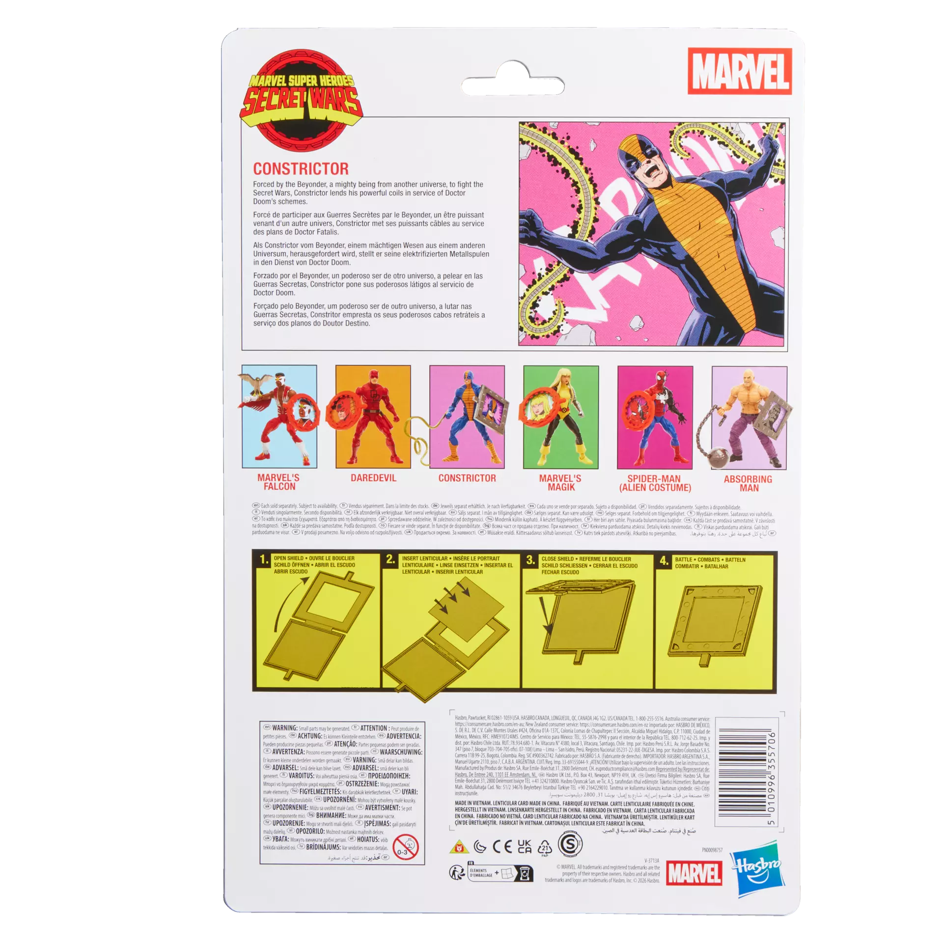 Deze Constrictor action figure komt uit de Marvel Legends Secret Wars serie van Hasbro en wordt geleverd met twee tentakels en een secret shield accessoire. Constrictor kan op veel punten bewegen en zit op een retro blister card verpakking.