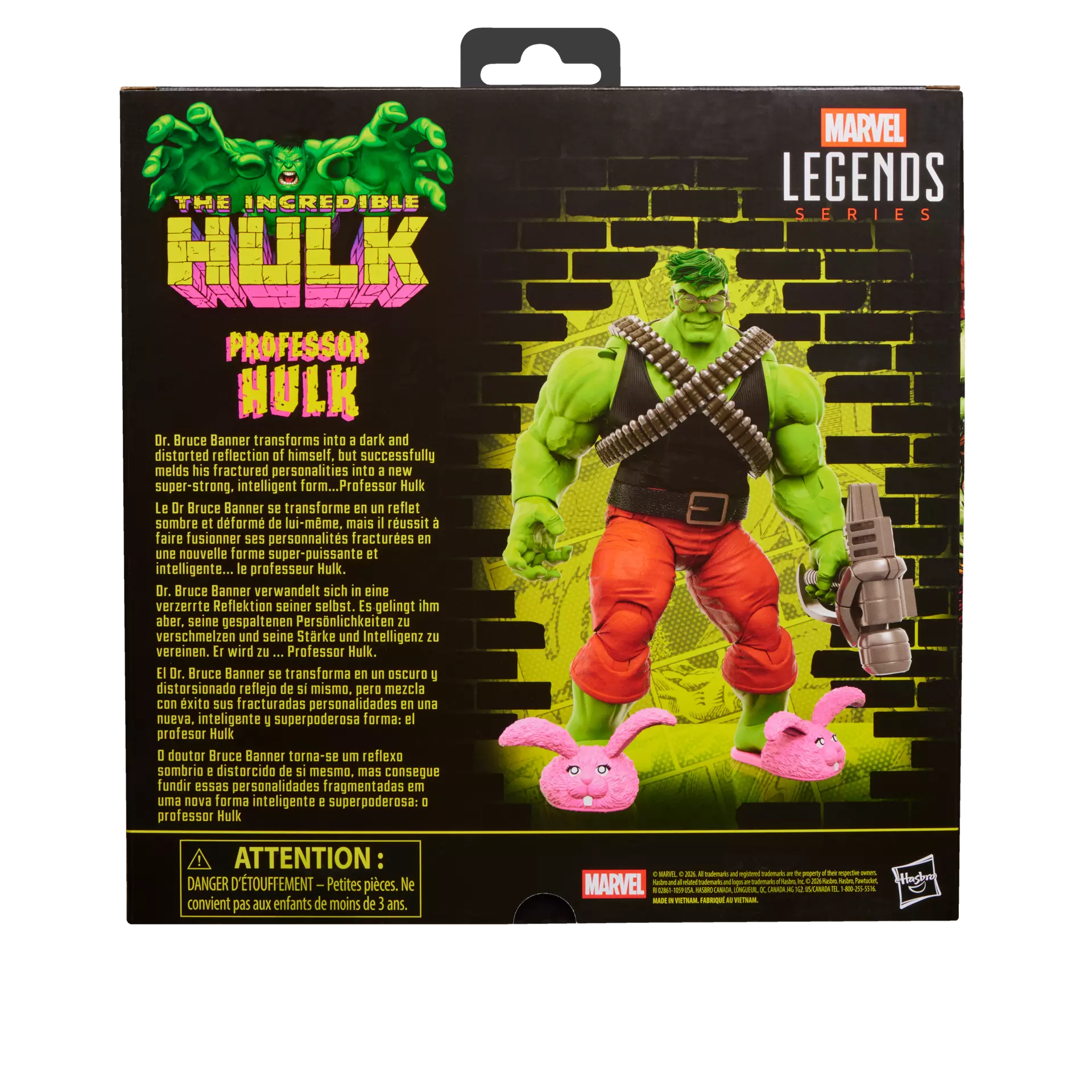 Deze action figure van Professor Hulk is 21cm hoog en kan op veel punten bewegen. Professor Hulk wordt geleverd met extra hoofd, bril, bunny slippers, wapen accessoire en 2 extra handen. Hij komt uit de The Incredible Hulk Marvel Legends Series van Hasbro.