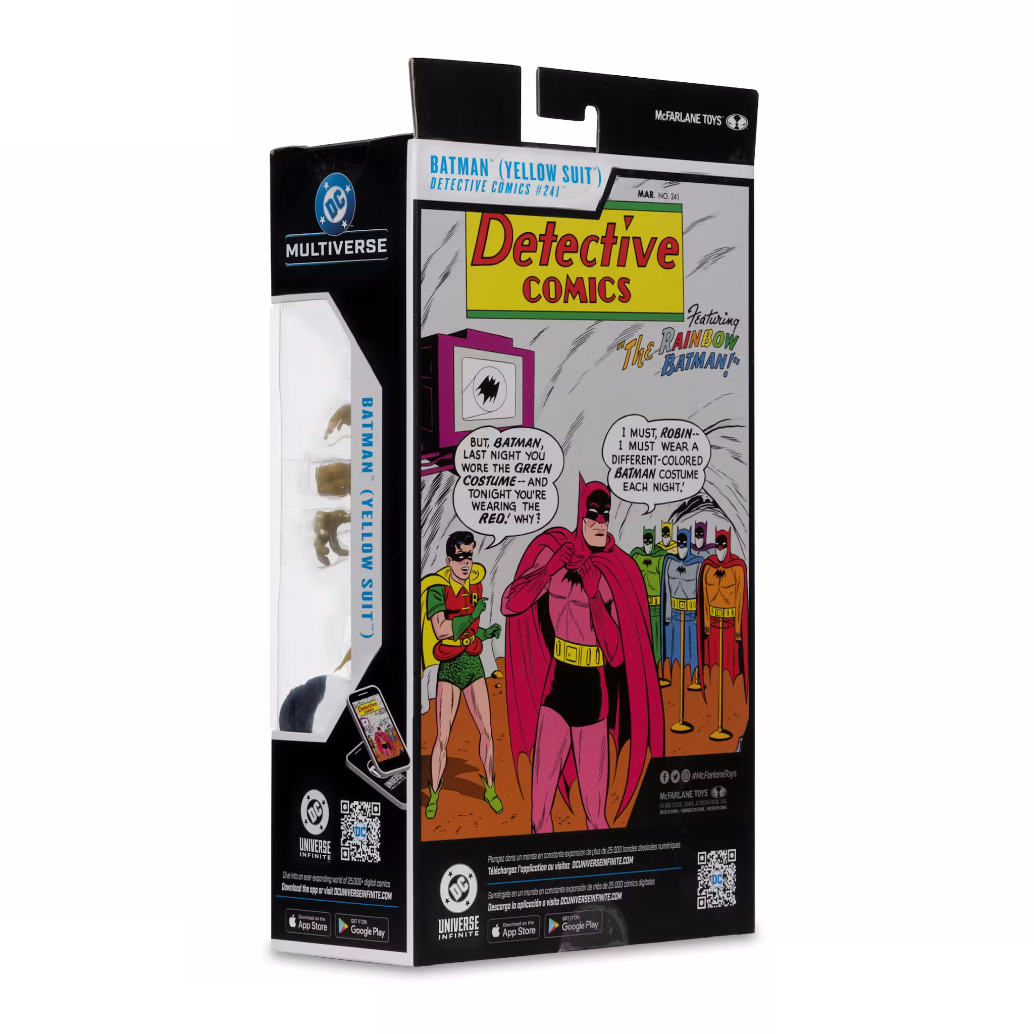 Deze Batman Yellow Suit is een zeer gelimiteerde Red Platinum uitgave van McFarlane. Batman Yellow Suit komt met vier extra handen en een batarang accessoire. Hij is 18cm hoog en kan op 22 punten bewegen.