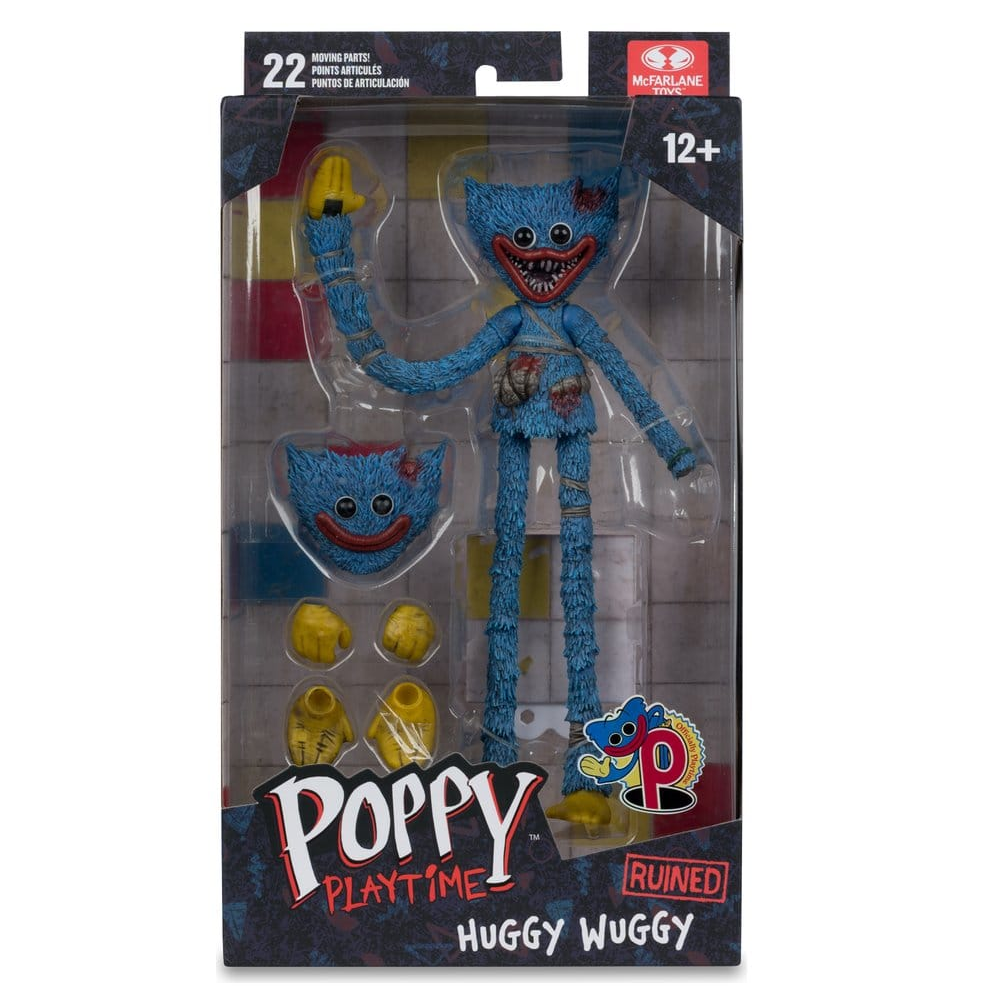 Deze Huggy Wuggy action figure uit de game Poppy Playtime is 19cm hoog en kan op veel punten bewegen. Hij is voorzien van buigbare ledematen en wordt geleverd met veel accessoires. Zo wordt er een extra hoofd, twee extra handen en twee extra voeten meegeleverd. McFarlane levert ook een standaard in Poppy Playtime stijl mee die je kunt verbinden met de standaard van andere figuren uit de serie.