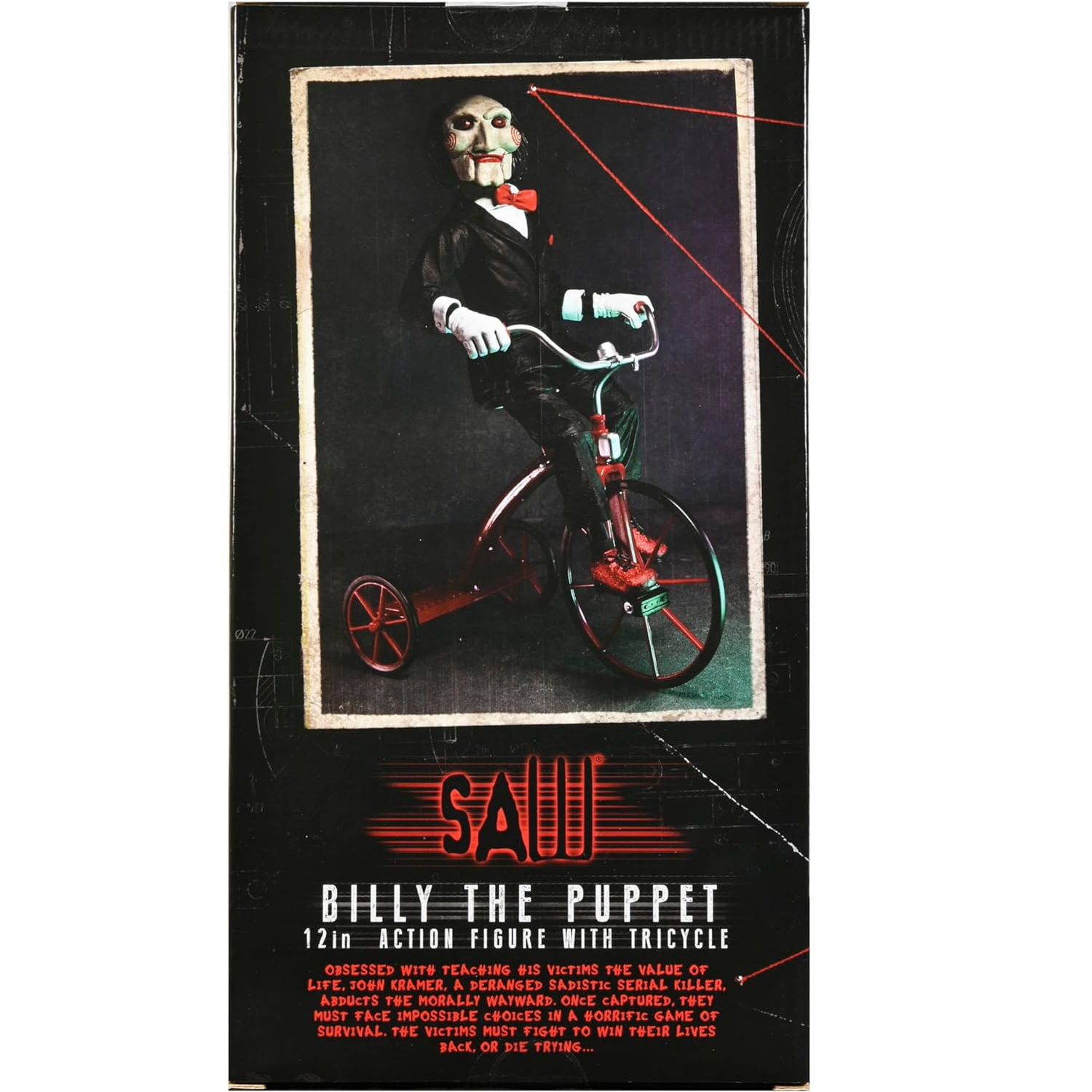 Deze Billy the Puppet uit Saw komt op een verrijdbare driewieler en speelt geluiden uit de film af. Billy the Puppet is 30cm hoog en kan op veel punten bewegen.