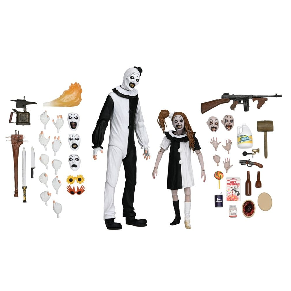 Deze set van Art the Clown & Little Pale Girl is gemaakt door NECA en komt met een enorme berg aan accessoires. Er worden veel wapen accessoires, extra handen en extra hoofden meegeleverd zodat je onwijs veel poseer mogelijkheden tot je beschikking hebt. Art the Clown & Little Pale Girl zijn gebaseerd op hun looks uit Terrifier 2 en kunnen op veel punten bewegen.