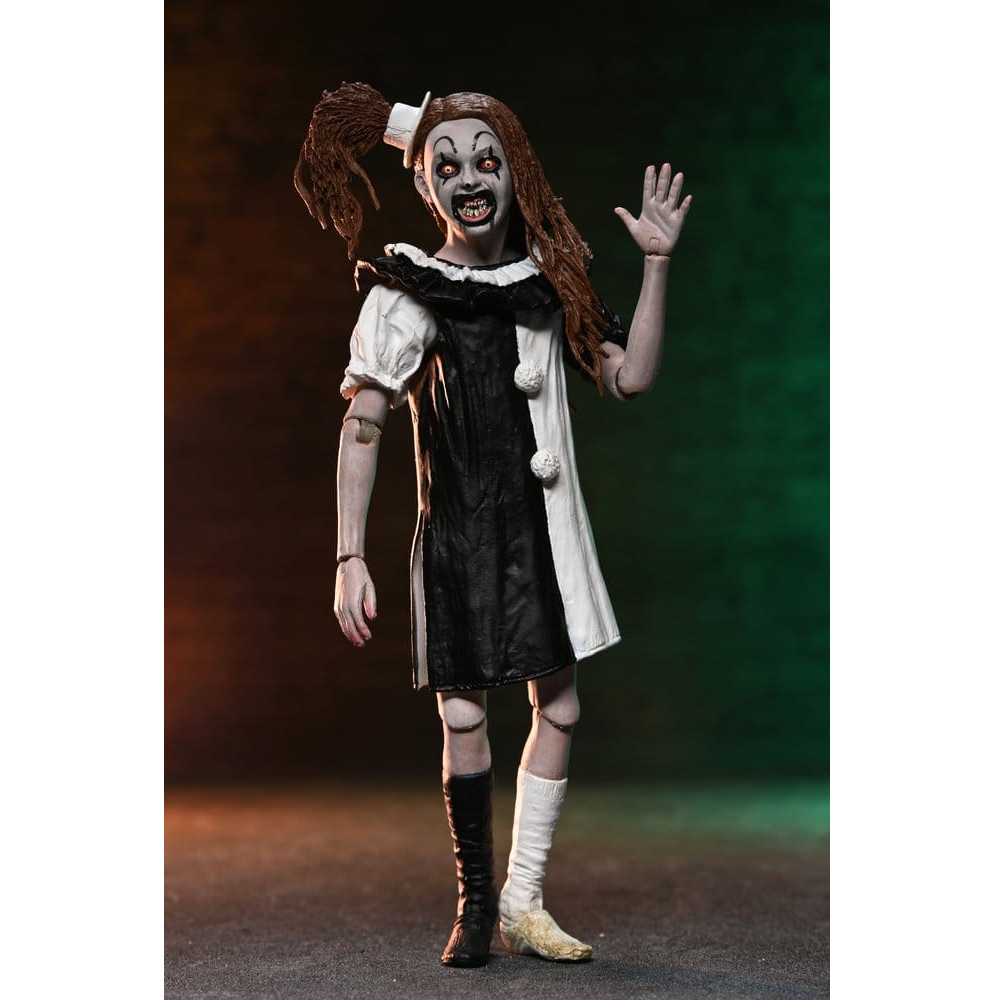 18cm hoge action figure van Art the Clown uit Terrifier 2 met een Little Pale Girl action figure.
