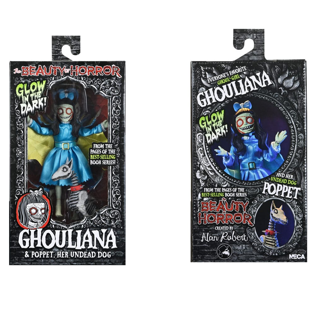 Deze Ghouliana action figure komt met echte stoffen kleding en haar trouwe pup Poppet. Ghouliana is 20cm hoog en kan op veel punten bewegen. Ze is gebaseerd op haar looks uit de boeken serie The Beauty of Horror en is voorzien van speciale Glow in the Dark verf.