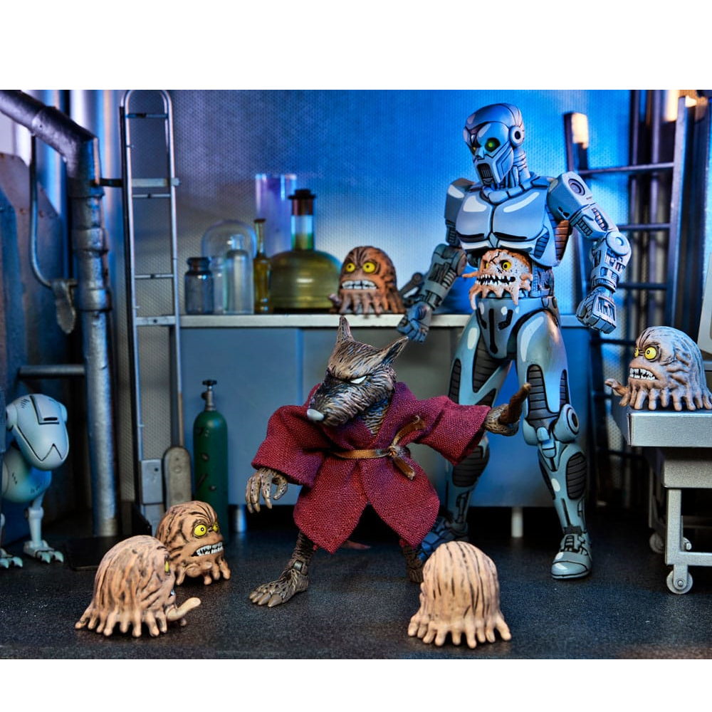 Deze Splinter action figure is gebaseerd op de Eastman & Laird Teenage Mutant Ninja Turtles comic books van Mirage Studios. Splinter is ongeveer 15cm hoog en komt met 4 extra handen, 4 baby turtles, stok, mini splinter, mouser, theepot met kopje, utrom en TCRI cannister accessoire. Hij kan op veel punten bewegen en is voorzien van veel details.