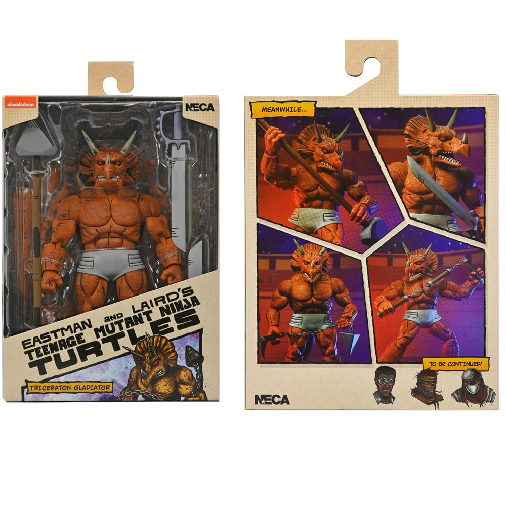 Deze Triceraton Gladiator action figure is 21cm hoog en kan op veel punten bewegen. Triceraton Gladiator komt met 6 extra handen en 5 wapen accessoires. Zijn ontwerp is gebaseerd op de Teenage Mutant Ninja Turtles (Mirage Comics) en hij zit in een window-box verpakking.