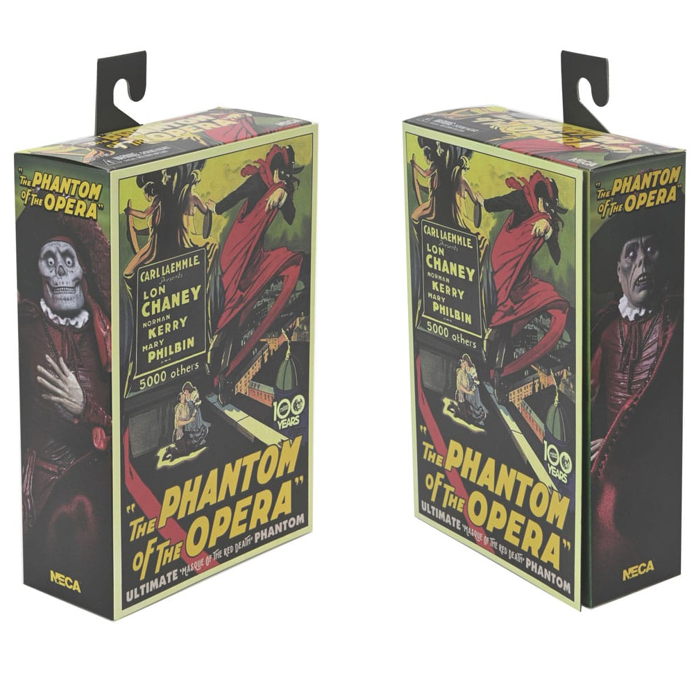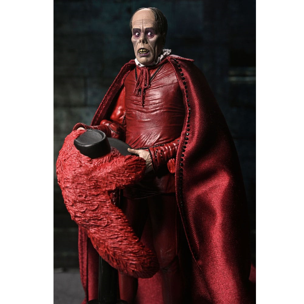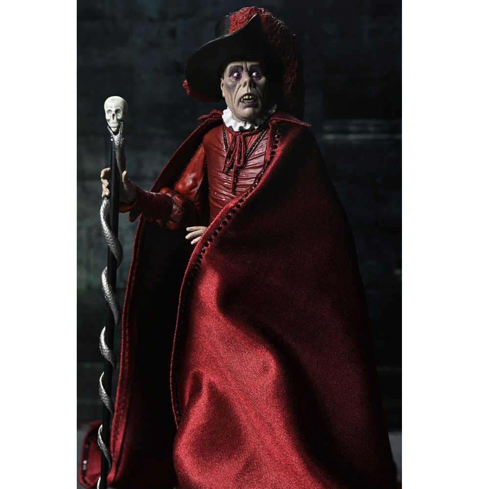 Deze The Phantom of the Opera action figure komt met hoed, staf, stoffen mantel, 2 extra hoofden en 4 extra handen. The Phantom is 18cm hoog en kan op veel punten bewegen. Deze Masque of the Red Death Phantom van NECA is voorzien van enorm veel details en mag niet ontbreken in je horror collectie.