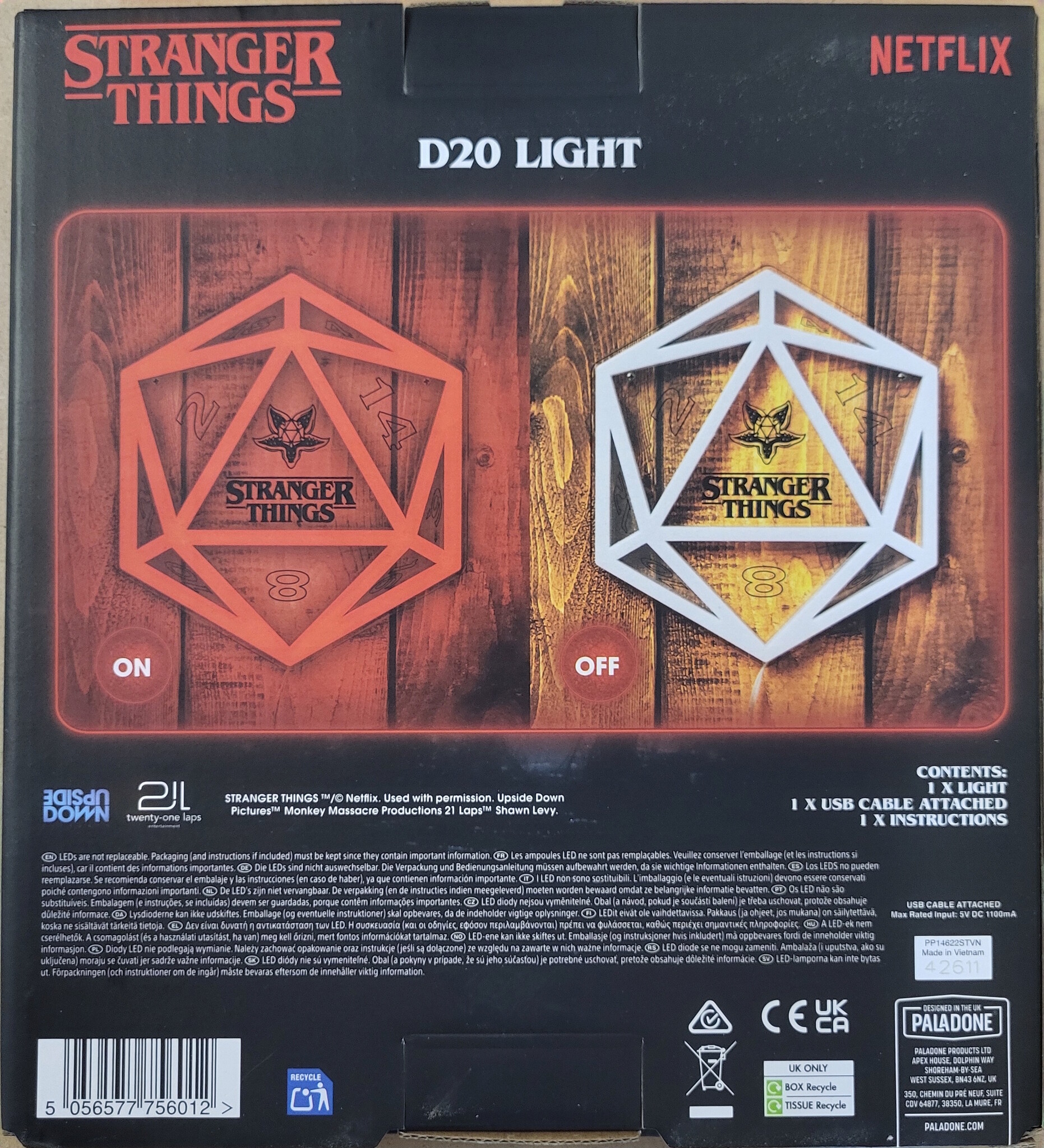 Stranger Things Neon Lamp in de vorm van een D20 dobbelsteen. Muur montage mogelijk. Voeding via USB (24 x 23 x 2 cm)
