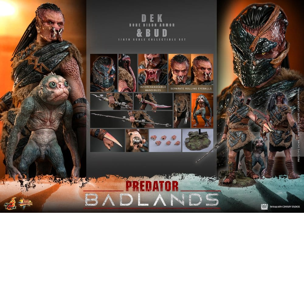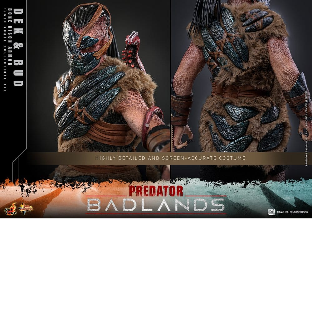 Deze set van Dek en Bud uit Predator Badlands is door Hot Toys voorzien van extreem veel details. Dek heeft zijn bone bison armor aan die deels van stof gemaakt is. Hij kan op veel punten bewegen en wordt geleverd met veel wapen accessoires en verschillende kaken om zijn looks te kunnen aanpassen. Daarnaast is hij voorzien van het Hot Toys rolling eyeball systeem zodat je zijn ogen individueel van elkaar kunt bewegen. Bud is een wat kleiner figuur die ook voorzien is van veel details en op veel punten kan bewegen. Er worden naar de wapen accessoires ook extra handen meegeleverd en een luxe standaard.