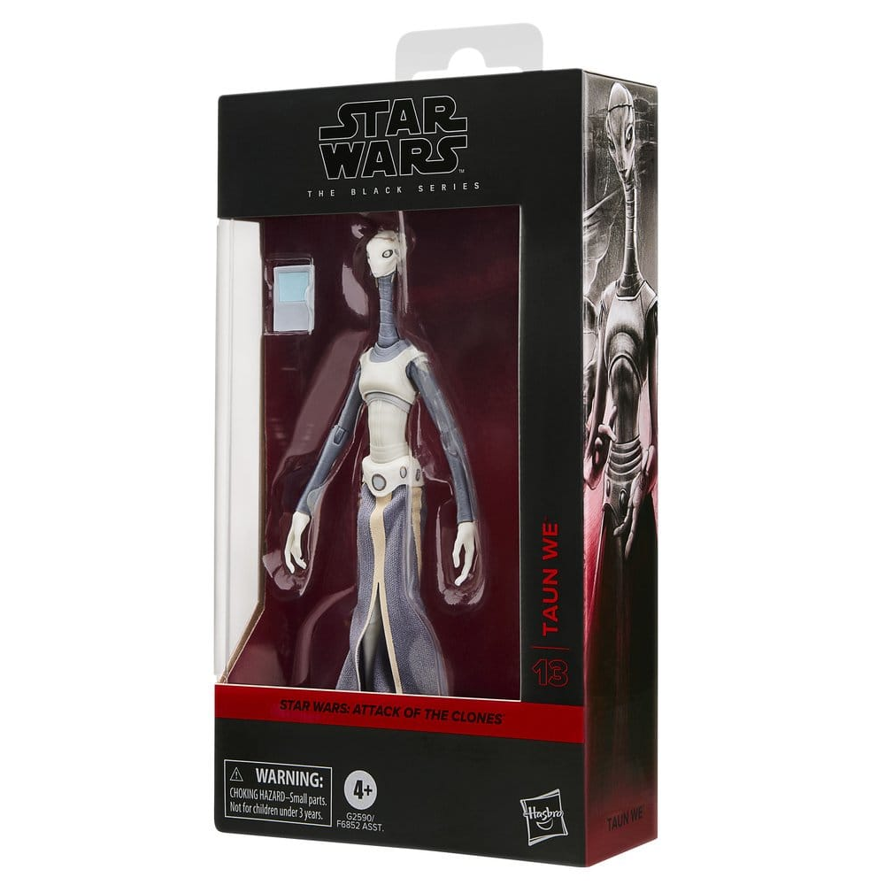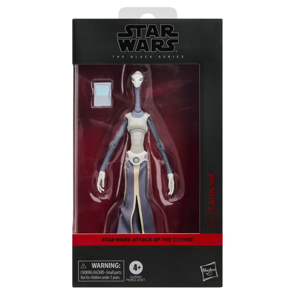Deze 15cm hoge action figure van Taun We uit Star Wars Attack of the Clones kan op veel punten bewegen en komt met tablet accessoire. Deze Taun We komt uit de Star Wars Black Series van Hasbro en is voorzien van veel details.