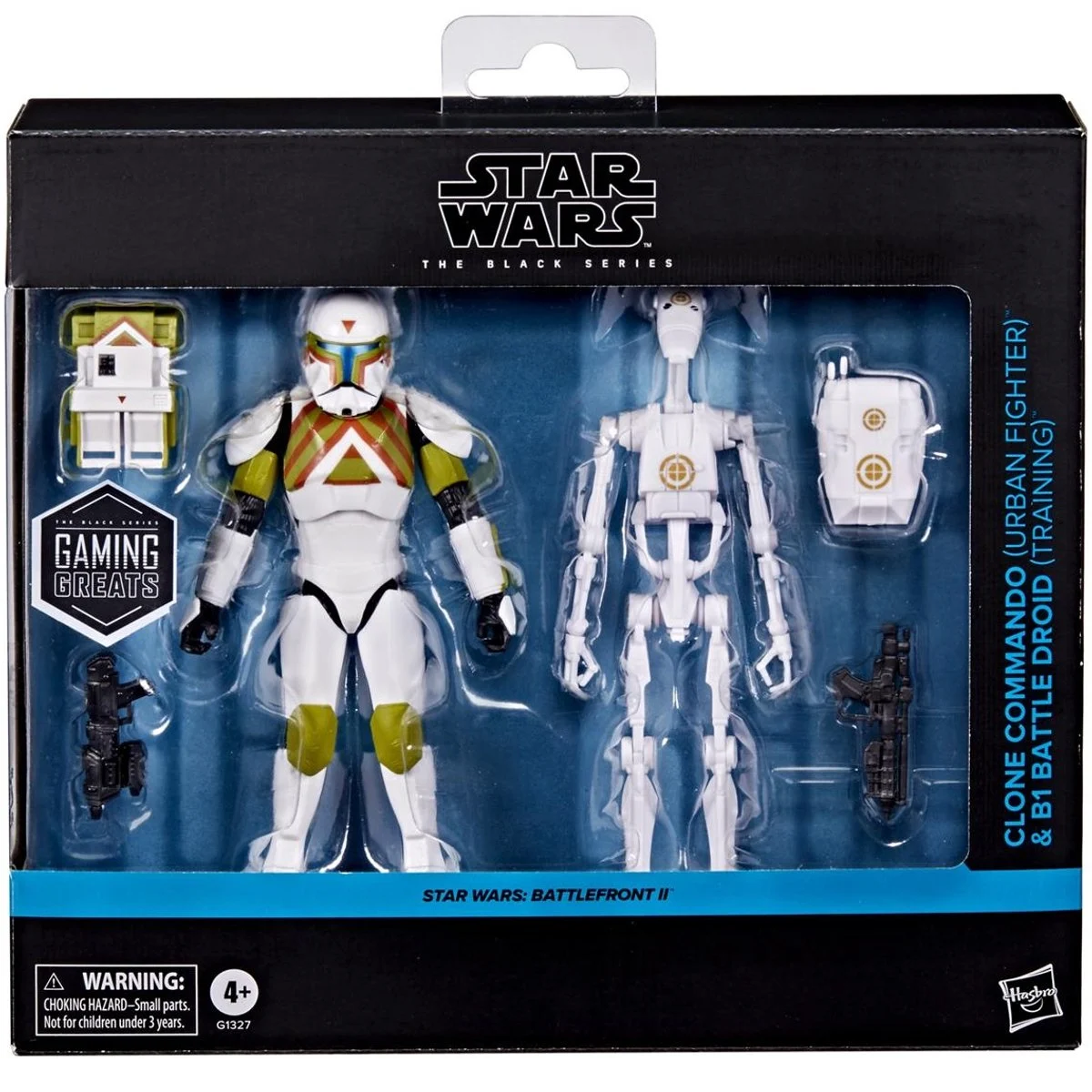 2-pack van twee 15cm hoge action figures van een Clone Commando & B1 Battle Droid uit de Star Wars Battlefront II Black Series van Hasbro.