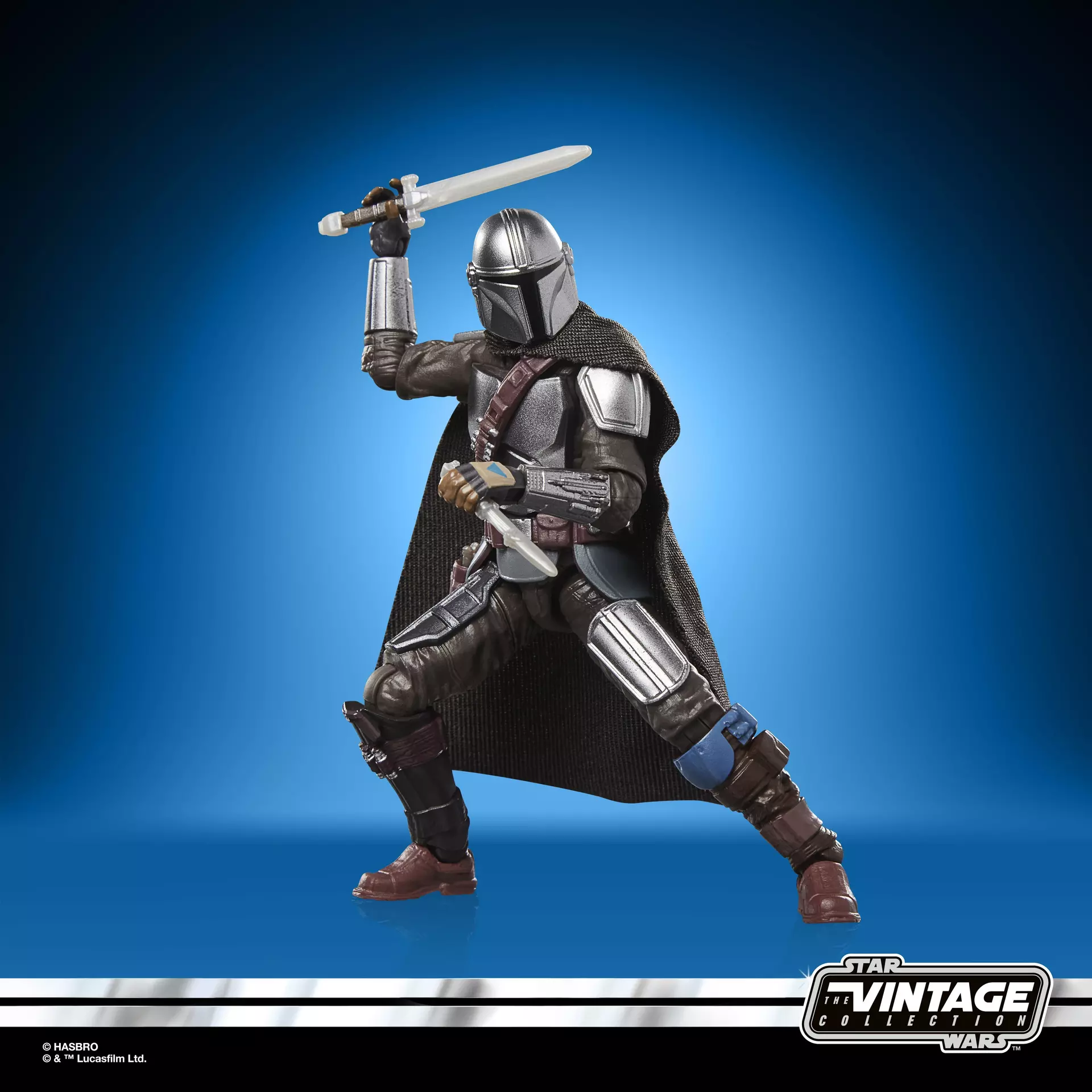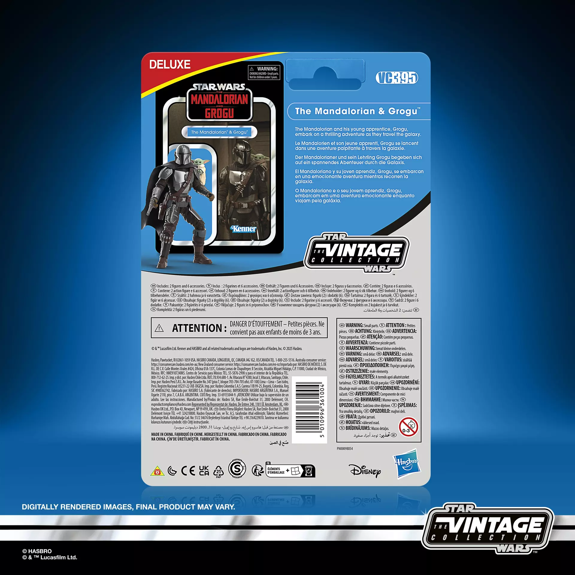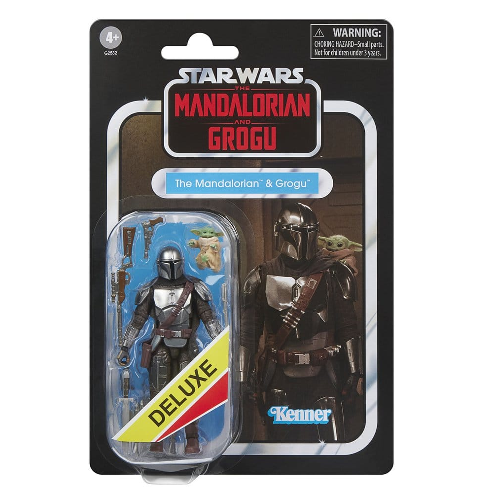 Deze deluxe action figure set van The Mandalorian & Grogu komt uit de Star Wars Vintage Collection van Hasbro. De set is gebaseerd op de film Star Wars: the Mandalorian & Grogu en wordt geleverd op een retro kenner blister card. The Mandalorian komt met een stoffen cape, extra hand, zwaard, mes, jetpack, rifle en een mini Grogu figuur.