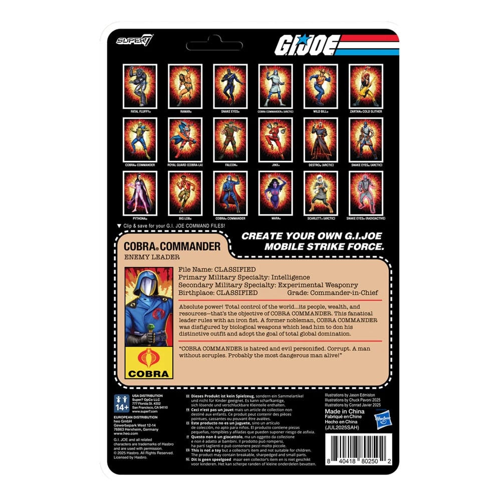 Deze Cobra Commander action figure komt uit Wave 5 van de Super7 ReAction+ serie en is gebaseerd op de G.I. Joe film uit 1987. Cobra Commander kan op meerdere punten bewegen dan de normale ReAction figuren. Hij wordt geleverd met twee accessoires en zit op een retro card blister verpakking.