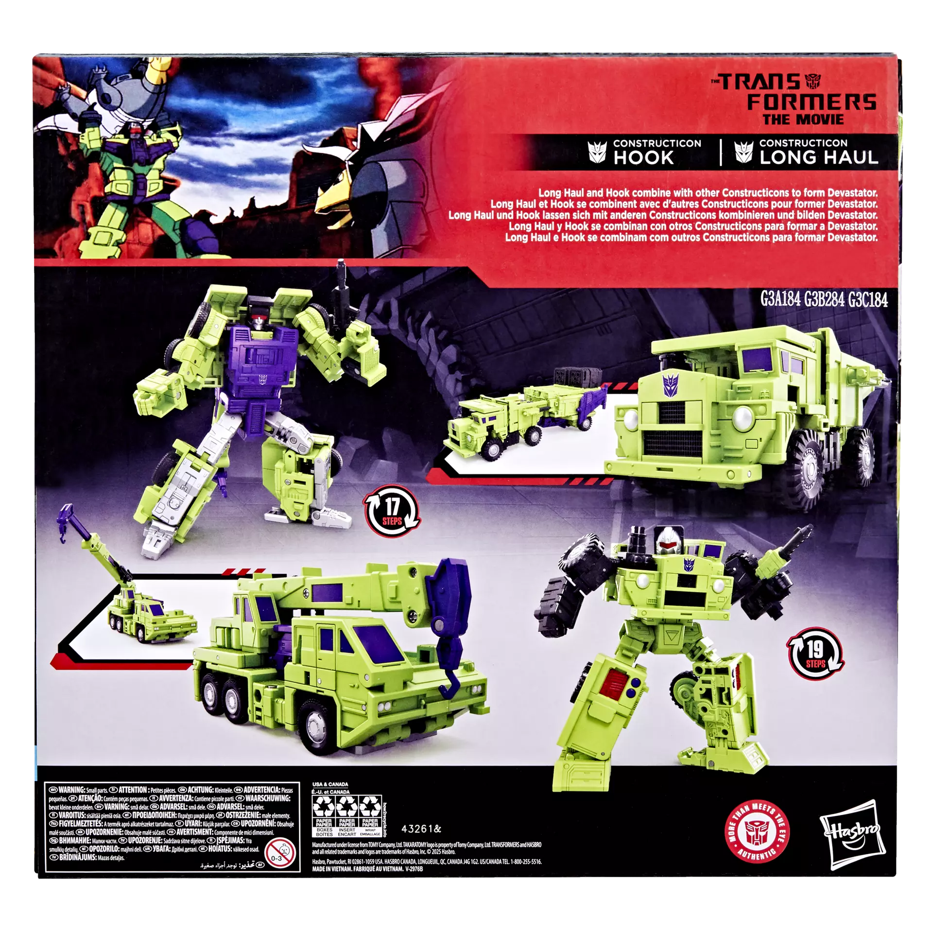 Deze 2-pack van Constructicon Long Haul & Constructicon Hook bestaat uit twee voyager class Transformers die gebruikt kunnen worden als onderdeel om de extra grote Devastator transformer te bouwen. Long Haul veranderd van robot naar dump truck in 19 stappen en hook veranderd van robot naar kraan in 17 stappen.