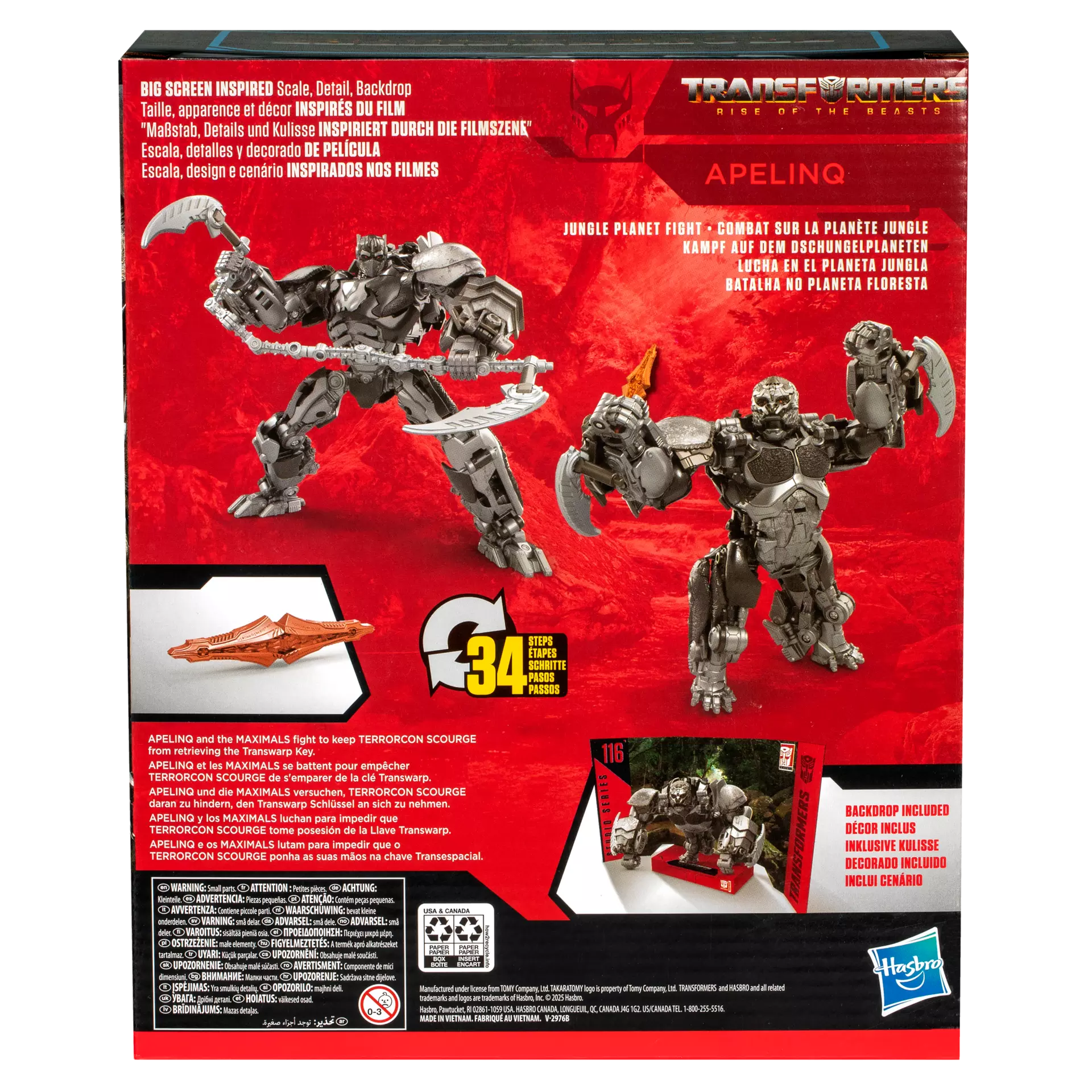 Apelinq is een Leader Class Transformer van 22cm hoog die veranderd van robot naar aap in 34 stappen. Apelinq komt uit de studio series 116 van Hasbro en zijn looks zijn gebaseerd op Transformers Rise of the Beasts. Hij wordt geleverd met zwaard, bijl en mes accessoire die in zowel robot als aap mode kunnen worden gebruikt.