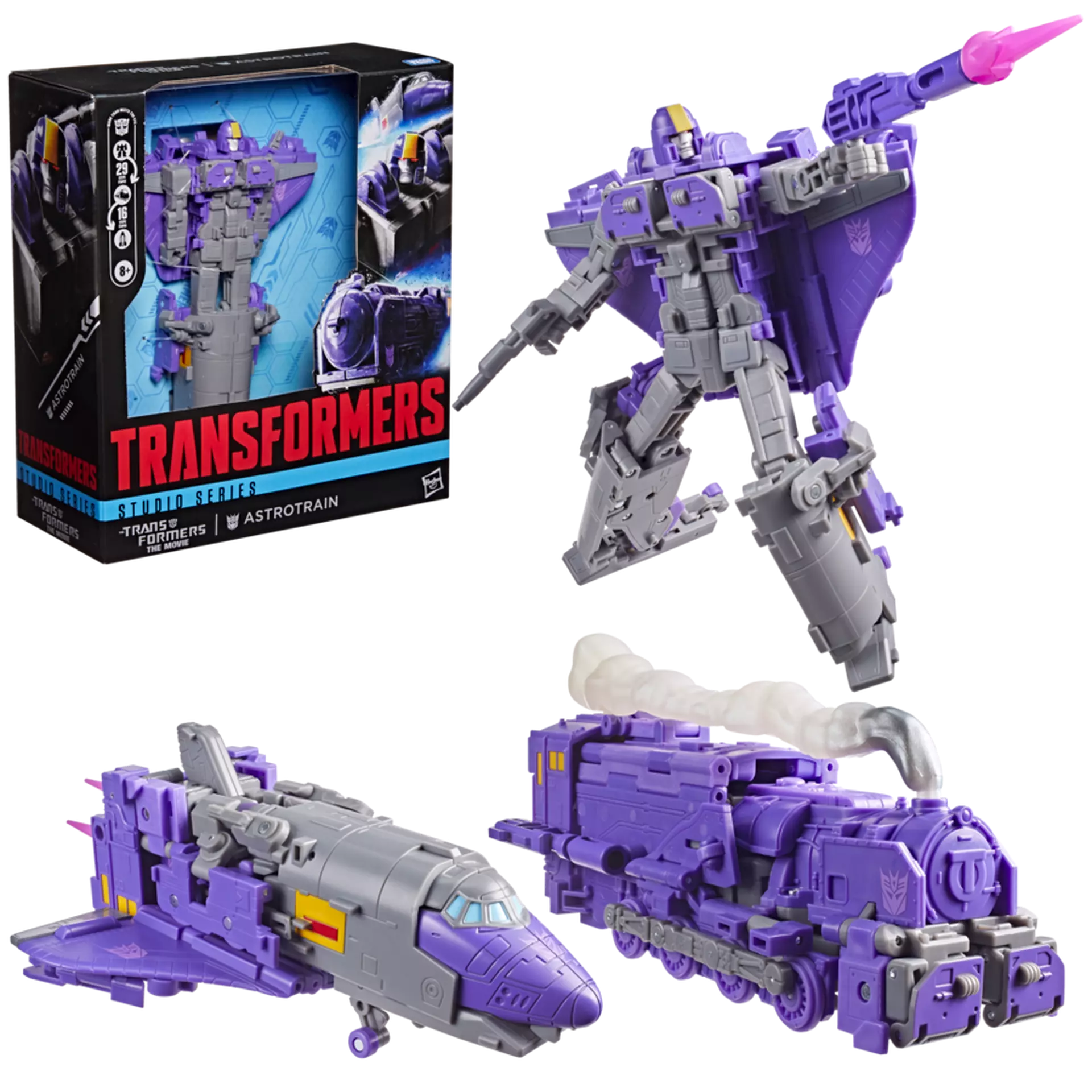 Deze Astrotrain Transformer veranderd in 29 stappen van robot naar trein en van van trein naar raket in 19 stappen. Astrotrain wordt geleverd met 2 blasters, 3 blast effecten en een smoke effect. Astrotrain komt uit de studio series van Hasbro en is een 17cm hoge leader class Transformer. Zijn ontwerp is gebaseerd op de film the Transformers: the Movie.